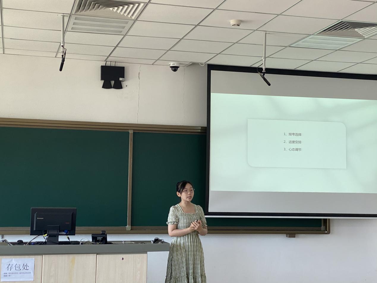 王子怡学姐首先与我们分享了该如何确定自己的志愿,随后着重讲了数学三、英语、政治和专业课的试卷题型分析、复习方法和做题技巧,最后鼓励同学们只有懂得坚持,忍受孤独,才能“守得云开见月明”。