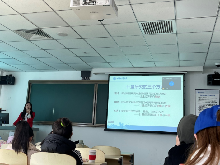 第二位分享者是张芝娟,学习平均成绩90.81分,2020级学硕第一名。她主要分享了计量经济学的学习方法,从理论、数据、方法三个方面对计量经济学的学习做了简明扼要的介绍:“理论”是指说明所研究对象的经济行为的经济理论,是计量经济研究基础;“数据”是对所研究对象经济行为观测所得到的信息,计量经济研究的原料和依据;“方法”是指模型的方法与估计、检验、分析的方法,是计量经济研究的工具与手段。三者相辅相成,缺一不可。