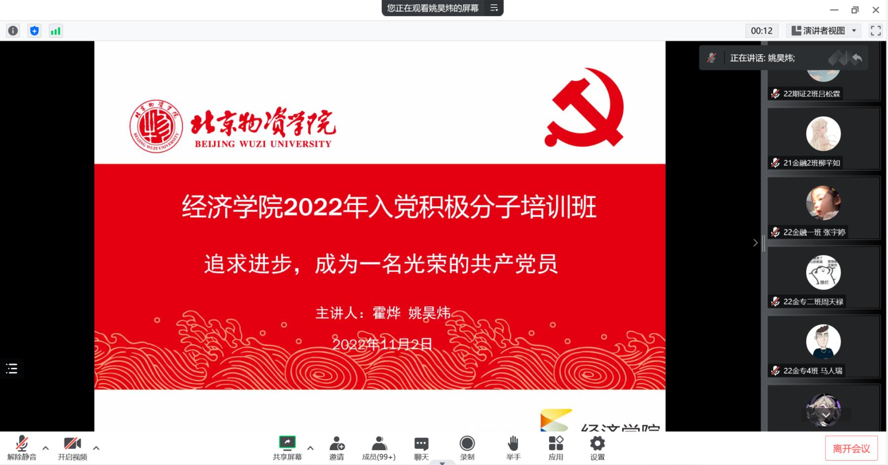 为进一步加强入党积极分子队伍建设,帮助同学们端正入党动机,坚定理想信念同时贯彻落实公司疫情防控要求,2022年11月2日中午,beats365线上举办2022年公司入党积极分子培训第一讲“追求进步,成为一名光荣的共产党员”。本次党课由beats365辅导员霍烨老师和姚昊炜老师主讲,2022年入党积极分子培训班共计210名学员参与学习。