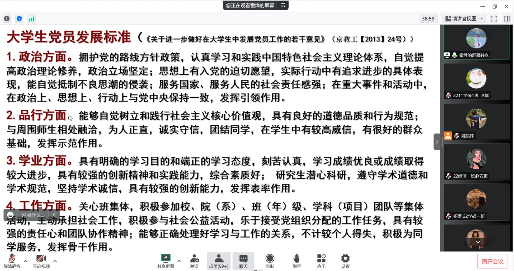 首先,霍烨老师作题为《守初心 时刻牢记党的宗旨 担使命 勇于担当积极作为》的主题报告,以习近平总书记的知青岁月和“七一勋章”获得者张桂梅董事长的感人事迹为例,引导同学们在学习和生活中积极向党组织靠拢。同时,霍烨老师将发展党员工作和同学们的实际学习、工作生活结合起来,从政治觉悟、品行规范、学业和工作等方面作细致深入讲解,希望同学们可以按照党员的标准严格要求自己,以实际行动表达向党组织靠拢的决心。