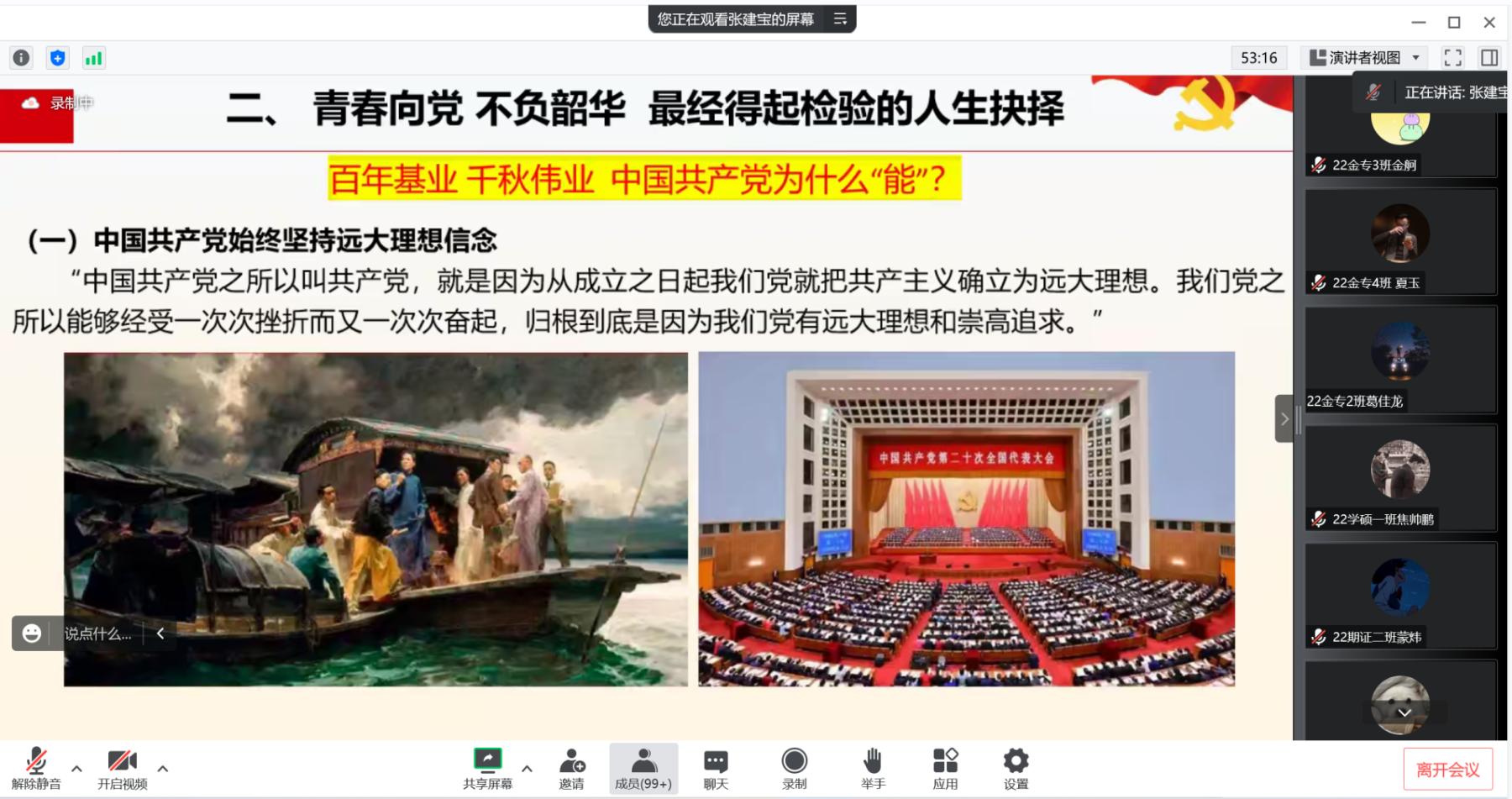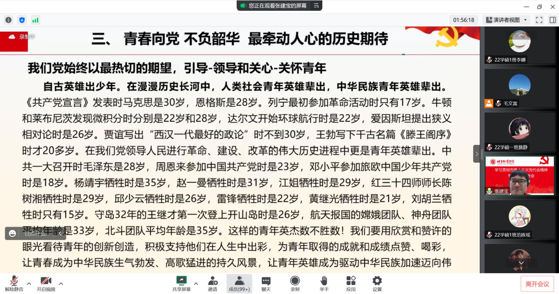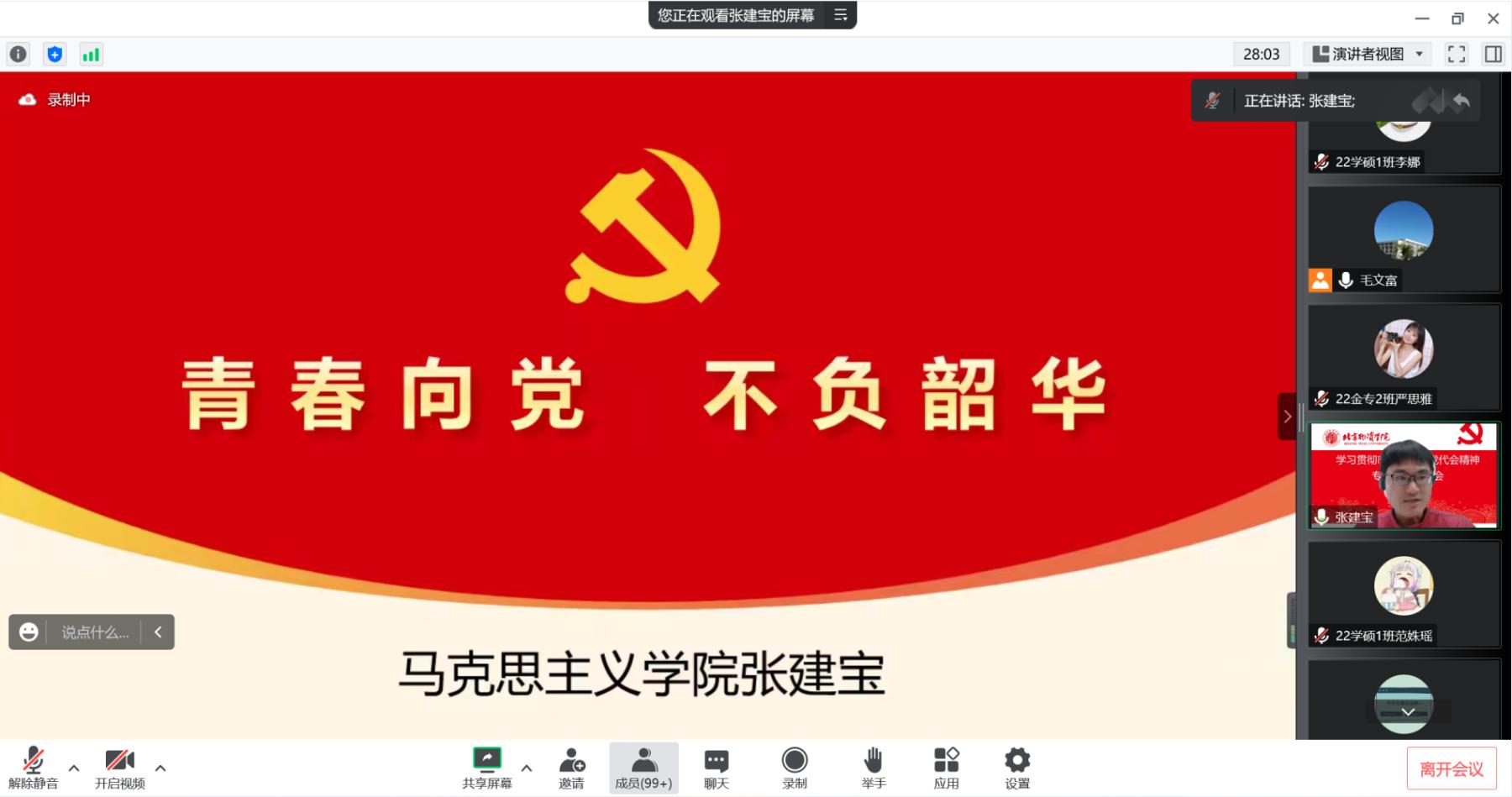 同时,张建宝老师结合二十大报告中与青年相关的内容,指出:中国共产党始终以最热切的期望引导和关怀青年,新时代中国青年的使命,就是坚持中国共产党领导,同人民一道,为实现“两个一百年”奋斗目标、实现中华民族伟大复兴的中国梦而奋斗。