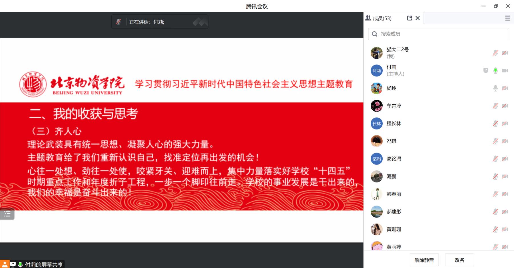 随后,付莉书记从以下四个方面来阐述自己学习习近平新时代中国特色社会主义思想的一些收获与思考。第一,强理论。她谈到了理论强是第一位的,它是前提,是根本,是必要条件。我们要从习近平新时代中国特色社会主义思想中汲取奋发进取的智慧和力量,熟练掌握其中蕴含的领导方法、思想方法、工作方法,不断提高履职尽责的能力和水平。第二,明方向。她用习近平新时代中国特色社会主义思想指导公司和公司的工作实际,强调了公司事业发展正处于爬坡期、攻坚期、转型期“三期叠加”的关键时期,机遇与挑战并重。现阶段公司发展的思路是:立足行业、立足首都的发展需求,突出自身特色,坚持内涵发展,找到突破点,以增量带动存量。第三,齐人心。她指出,主题教育给了我们重新认识自己,找准定位再出发的机会,我们也已经在奋起直追的赛道上了,现在只有心往一处想、劲往一处使,咬紧牙关、迎难而上,集中力量落实好公司“十四五”时期重点工作和年度折子工程,一步一个脚印往前走。第四,拒躺平。她对躺平的概念的内涵和外延进行了深入分析,并总结出破解躺平的路径。呼吁要努力打造干部 “不想躺”“不能躺”“不敢躺”的环境和氛围,让所有的干部“动起来、站起来、跑起来”。