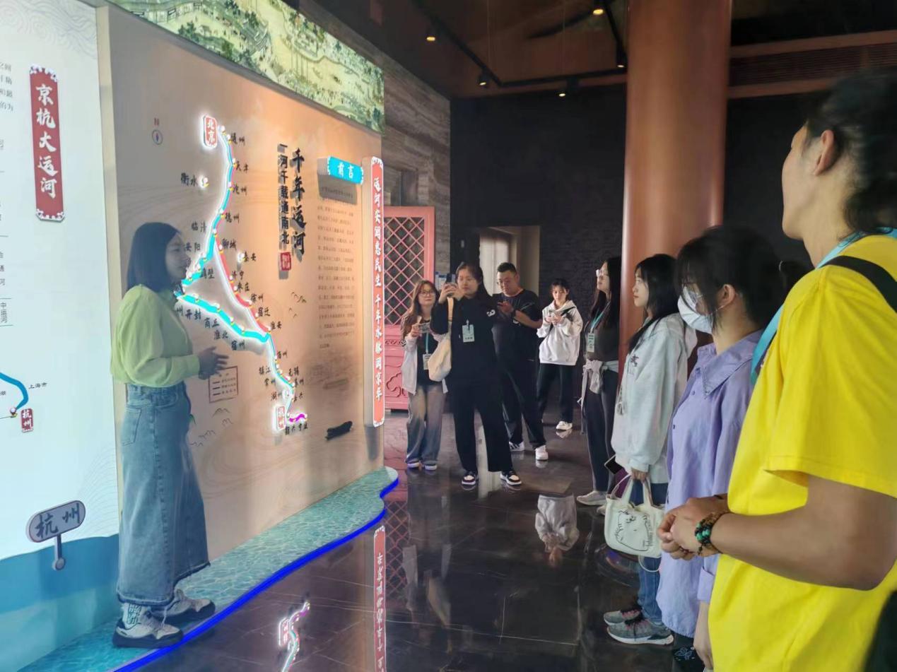 在大光楼北运河北关分洪枢纽,同学们参观了北运河水环境治理和文化保护的专题展览,通过北运河管理处工作人员的介绍与讲解,了解了近年来北运河水域的环境发展与变化,水质从指标“不健康”到“健康”美丽的变化过程。同学们登上大观楼,观察五河交汇口的水域情况,实地了解了通州区北运河的水文和闸口建设,聆听了北运河管理处在“运河安澜惠民生”项目中,承担北京防洪和排涝工作中的贡献。