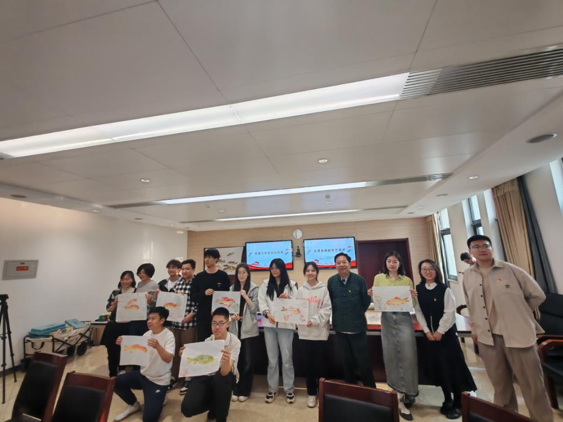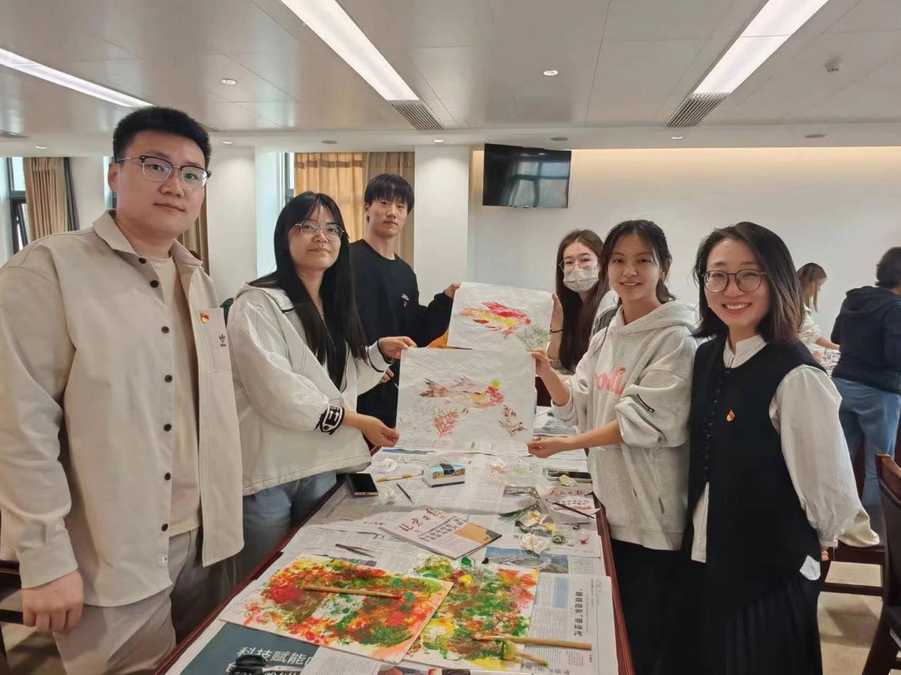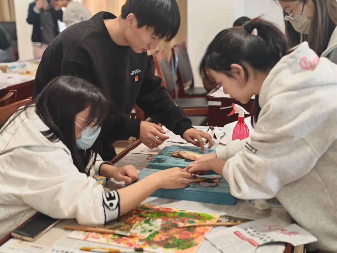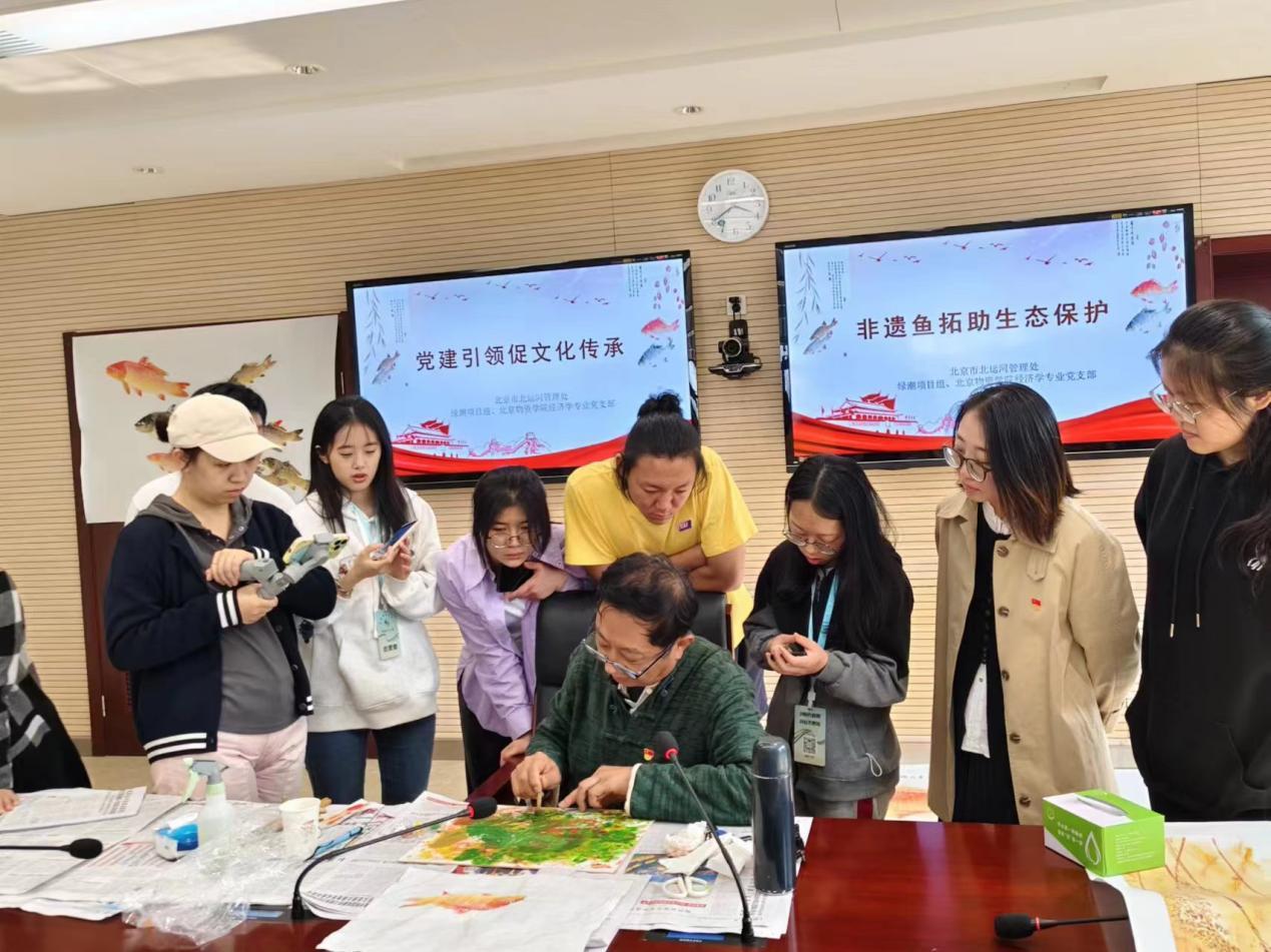 随后党支部前往北运河管理处,以“鱼拓非遗助力生态保护”开展了非遗鱼拓技艺共建学习。活动现场非遗传承人胡老师介绍了鱼拓技艺的由来和文化价值,现场展示并教授了同学们鱼拓技艺的做法。
