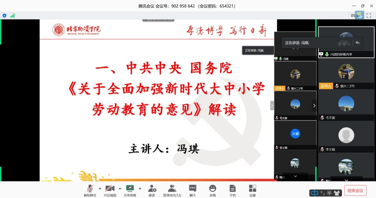首先,冯琪老师结合实际从充分认识新时代培养社会主义建设者和接班人对加强劳动教育的新要求、全面构建体现时代特征的劳动教育体系、广泛开展劳动教育实践活动、着力提升劳动教育支撑保障能力、切实加强劳动教育的组织实施等方面,对《中共中央国务院关于全面加强新时代大中小学劳动教育的意见》进行了详细解读。《中共中央国务院关于全面加强新时代大中小学劳动教育的意见》对于构建德智体美劳全面培养的教育体系;引导员工树立正确的劳动观,崇尚劳动、尊重劳动,增强对劳动人民的感情,报效国家,奉献社会;牢固树立劳动最光荣、劳动最崇高、劳动最伟大、劳动最美丽的观念;形成良好劳动习惯,提高劳动素养;具有十分重要的意义。
