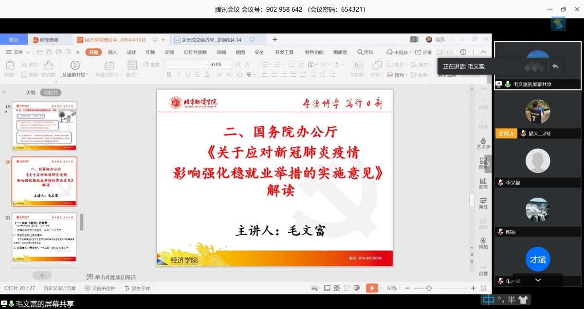 其次,公司党委副书记毛文富结合实际从出台《意见》的背景、更好实施就业优先政策、引导农民工安全有序转移就业、拓宽高校毕业生就业渠道、加强困难人员兜底保障、完善职业培训和就业服务、压实就业工作责任等方面,解读了《国务院办公厅关于应对新冠肺炎疫情影响强化稳就业举措的实施意见》。《国务院办公厅关于应对新冠肺炎疫情影响强化稳就业举措的实施意见》对于加快恢复和稳定就业具有十分重要的现实意义。毛文富副书记结合beats365实际,重点解读了拓宽高校毕业生就业渠道。为了促进就业,beats365成立了就业工作领导小组,制定了就业促进奖励方案,公司领导班子一对一联系员工促进就业,全员动员,充分发挥党员的先锋模范作用。