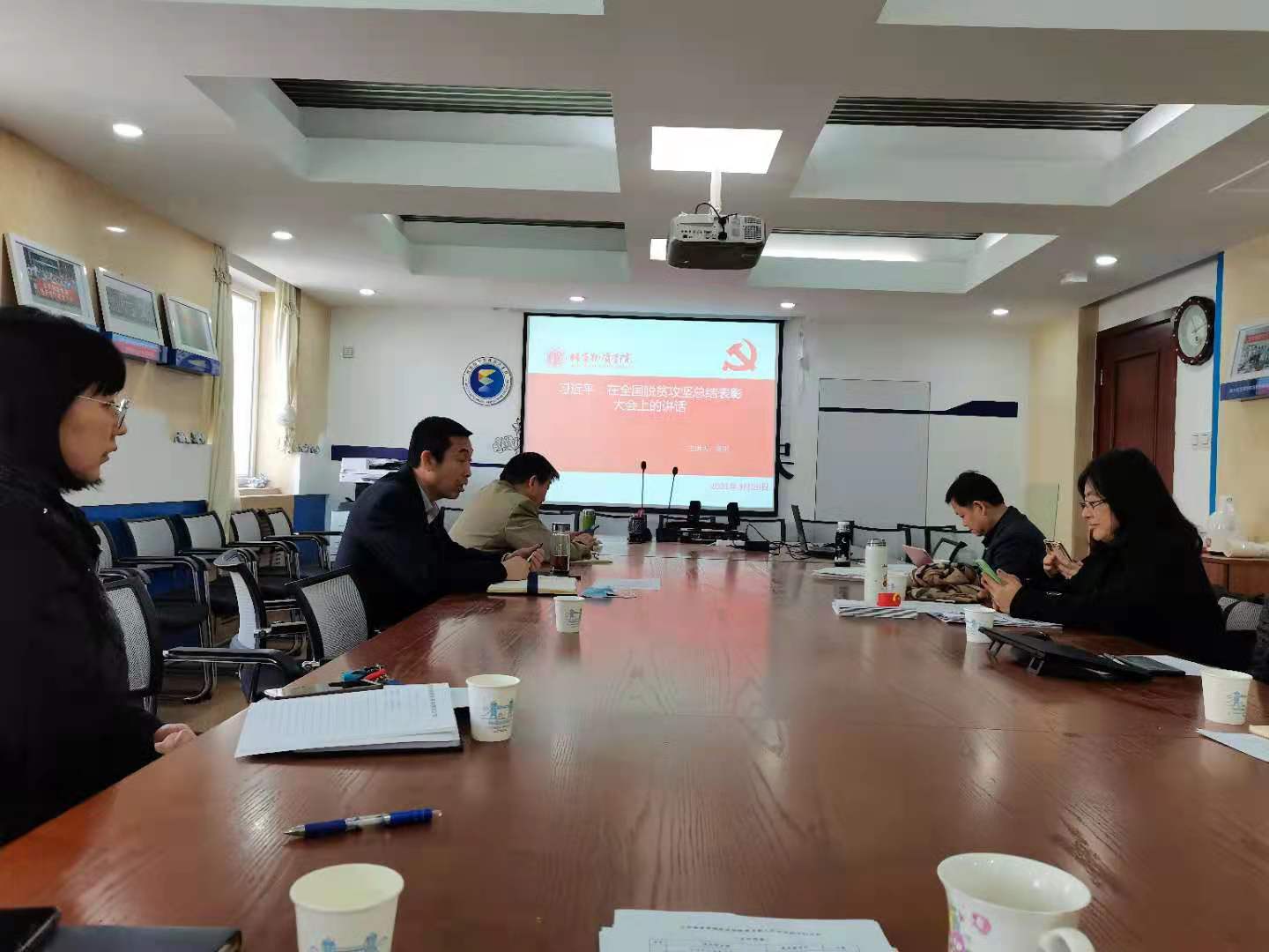 国贸系教工支部书记李彤老师主讲了《习近平总书记在全国脱贫攻坚总结表彰大会上的讲话》。李老师详细介绍了习总书记在全国脱贫攻坚总结表彰大会上的讲话的五个部分,第一部分用图片展示了表彰的先进个人楷模和先进集体楷模;第二部分讲解了五个历史性成就;第三部分生动介绍了七个中国特色反贫困理论;第四部分简要总结了六种脱贫攻坚精神;第五部分是任重道远,号召全国人民乘势而上、再接再厉、接续奋斗。听完李老师的讲解,了解了全国脱贫攻坚取得的重大成果,老师们深受感动和震撼,全国脱贫攻坚战的胜利,对农村的意义巨大,对弱势群体的帮助很大,对社会公平、社会稳定有很重大的意义。
