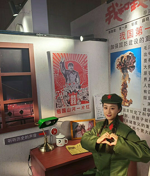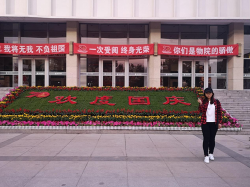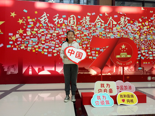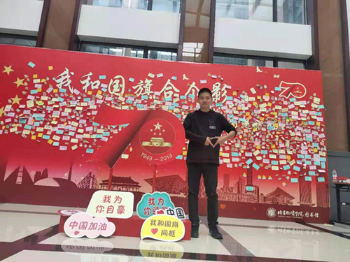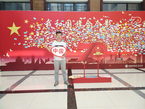 这张照片的背景是图书馆的祝愿墙,墙上贴着满满的对祖国的祝福,表达了物院学子对祖国的热爱,更从侧面体现了建国七十周年来祖国的辉煌成就以及给人民带来的巨大自豪感。