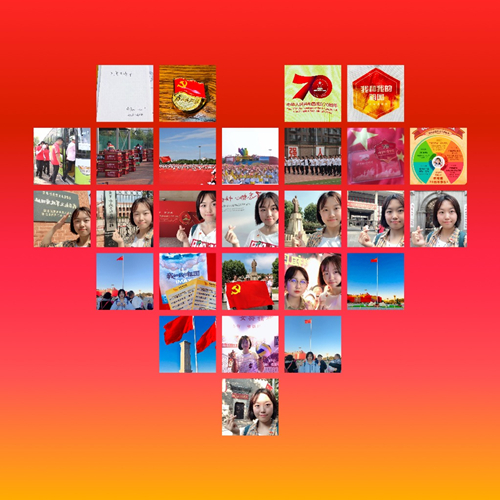 背景色用中国红来象征喜迎祖国70周年华诞的气氛, 用个人的照片拼出心形来表达我的祖国的爱。