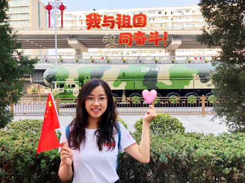 今年是国庆70周年,10月1日的阅兵式让我热泪盈眶。我们国家从一穷二白到如今的站起来,富起来,强起来经历了几代人艰苦卓绝的努力,当我们在大学的教室中学习,我们可曾想过今天的幸福的生活是前辈中抛头颅,洒热血换来的。青年强则国家强,我们青年人应该加倍努力,不辜负前辈们为我们打下的盛世,创造更美好的社会,为中华民族的伟大复兴不懈努力!