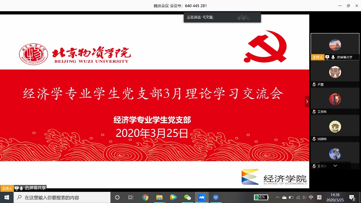 经济学专业员工党支部自2020年3月13日起,开展“守专业初心,担专业知识使命——用专业知识为中国经济保驾护航”的三月理论学习活动。活动期间该支部党员和入党积极分子们在学习强国平台线上学习了刘伟教授关于《如何看待新冠肺炎疫情影响下2020年中国经济增长》这一课程并提交了个人思想汇报。为了交流分享前期学习成果,经济学专业员工党支部于3月25日下午1点30分在腾讯会议线上召开三月理论学习交流会。参加此次会议的有公司党委副书记毛文富老师、经济学专业员工党支书记夏蓓老师、支部内41位党员同志。为深入落实党团班一体化建设,经济学专业5位入党积极分子和20位优秀团员代表也参加了本会议。会上,主持人夏蓓老师首先介绍了本次理论学习的背景及意义。接下来李鑫、王明哿、密星汝、葛雄飞和范亚娟五位同志依次分享学习成果。其中李鑫同志认为虽然疫情对我国经济短期内有较大影响,但是中国长期向好的趋势没有改变。我们国家具有天时地利人和的优势,能够集中力量办大事。在五位同志的精彩分享后,奚佳旺、刘鑫蕾和张森诚三位同志结合此次理论学习和疫情期间个人发展情况,分享了个人感悟。最后,毛文富老师和夏蓓老师对会议进行了总结点评。毛文富老师首先肯定了本次理论学习活动的必要性,并对与会同志分享的观点表示认可。随后他举出抗日战争、98抗洪、四川汶川地震等事例来说明中华民族是一个不惧苦难、有韧性的民族。在此次疫情影响下,中国经济也会摆脱困境,逐渐步入正轨。此外,毛文富老师向各位同学提出深切期望:在重大事件的影响下,我们要学会保持良好心态,摆脱焦虑;在立足于个人的同时,还要树立长远的利益观和大局观;要有紧迫感和危机感,愿只争朝夕不负韶华!