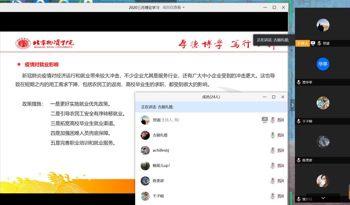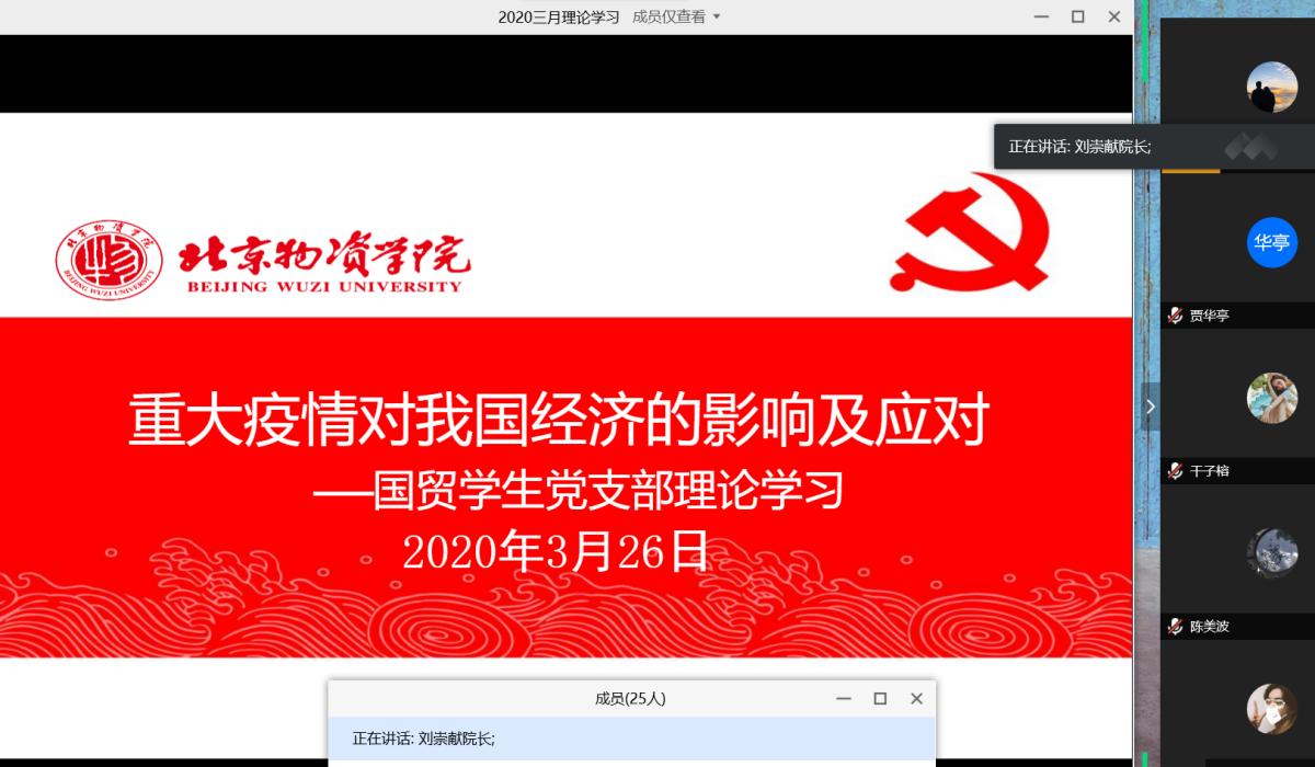 国际经济与贸易员工党支部于2020年3月26日下午1时30分于线上开展了第二届党员先锋抗“疫”系列活动之理论学习。beats365科研副经理刘崇献、支部书记陆畅、支部全体员工党员及入党积极分子参加了本次活动。党支部通过学习强国、形势与政策课程开展了以“重大疫情对我国经济的影响及应对”为主题的理论学习,每位同学形成了学习成果。活动中,贺迪、古丽扎提、丁乔力、尹玉婷四位员工党员分享了主题课程学习的心得体会,与党支部同学开展了交流。活动由党支部书记陆畅主持。