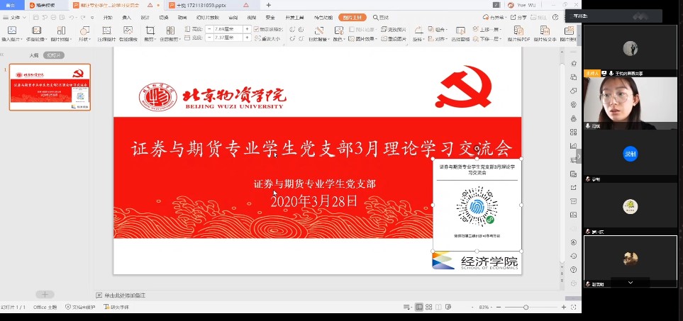 证券与期货专业员工党支部于3月28日15:00-17:00通过腾讯会议开展了2020年3月理论学习的云端研讨会,主题为“用专业知识为中国经济保驾护航”。党支部共57名员工党员和预备党员,以及部分积极分子参会,会议由党支部书记冯琪老师主持,并有幸邀请到张国胜经理参会并进行指导。