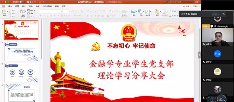 在长达两个小时的研讨会议中,首先由党支部书记冯琪老师介绍本次理论学习的背景及意义,其后党支部的12名员工党员依次从不同角度、不同金融领域,利用专业内所学知识及金融相关拓展知识,从整体经济层面出发,首先讨论当前疫情经济政策方向及有序复工复产逐渐恢复产能后,对于总需求总供给方面的冲击影响;进而结合互联网金融等新兴模式,谈论国际贸易进出口、原油、股市、期货市场、信贷危机等严峻话题;再到疫情对我国企业及民生的诸多不利影响,作为党员又应如何进行帮扶等民生问题。会议期间,大家踊跃发言,三名预备党员分享了此次理论学习的收获与感悟,详细复述了疫情对当前国内宏观经济及国际间经济贸易的影响,并对于如何恢复经济三名同学结合自己的学习体会提出了各自的想法与建议。云端党员分享学习的全新开展形式,丝毫未影响期证支部每位员工党员的积极学习热情,大家踊跃讨论金融问题并记录详细笔记。会议过程中,通过开启的摄像头可以看到所有党员精神面貌饱满,细致聆听后,均深感受益匪浅。