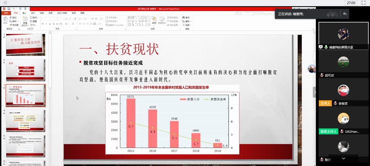 卢媛媛和贾淙沅介绍了我国当前脱贫攻坚工作的完成情况,在此基础上结合疫情介绍了剩余脱贫攻坚工作面临的困难和挑战,并号召老员工对打赢脱贫攻坚战奉献自己的力量;李俊贤、王月龙分别介绍了自己的家乡湖北恩施和北京密云在新冠疫情下的扶贫情况以及取得的扶贫成果;王浩楠、王若和徐慧雅结合具体的事例讲述了在脱贫攻坚工作中的青年老员工力量;