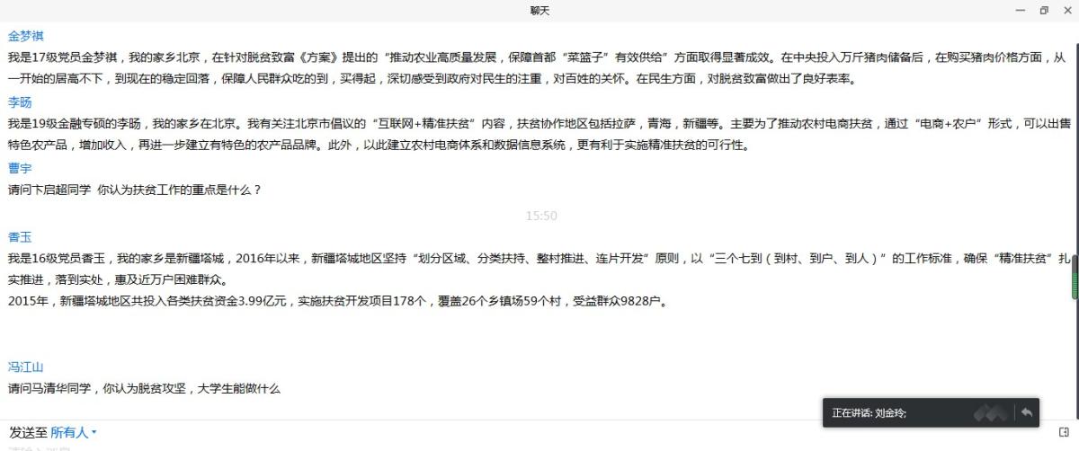 在此次学习研讨过程中,期证党支部来自北京、山东、新疆等多省多地的员工党员同志在冯琪老师的带领下新增添了“群内分享讨论”环节。作为全新的理论学习模式,以“脱贫攻坚”为背景,此活动旨在鼓励正式党员同志积极分享家乡故事,充分了解所在地扶贫政策的进一步开展及成效、主动关注民生变化及向好改善现象;同时,要求预备党员主要针对11位员工党员的分享内容进行相关提问,深化“脱贫攻坚”的工作重点、总体目标、影响范围等方面的思想,了解精准扶贫方案如何推进、新时代加强劳动教育的意义,以及如何在实际生活和工作中践行真正的“扶贫精神”,以此来逐步提高预备党员的思想觉悟意识,使其向高标准严要求的正式党员身份靠近。