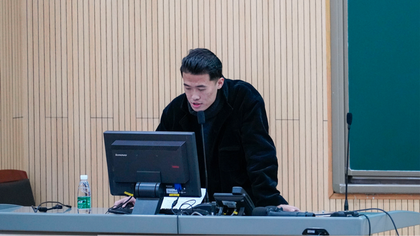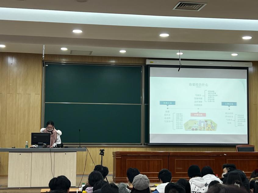 随后,由在大创项目中获得了优异成绩的2020级唐铭苛同学向大家分享了关于参加大创活动的经验与方法。她从什么是大创、大创的准备过程以及大创活动的注意事项等几方面向同学们清楚阐述并仔细说明了她参与大创的经验。