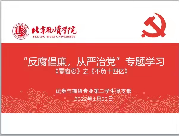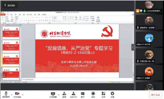 为进一步筑牢和坚定党员理想信念,深化党性修养,加强党内组织纪律性, 贯彻我党自我革命的先进性,证券与期货专业第二员工党支部在冯琪老师的指导下于2022年寒假期间组织开展了为期5周的“反腐倡廉,从严治党”专题学习。本次学习以组织线上集中观看专题系列片《零容忍》的方式进行,参与对象包含了党支部所属党员、发展对象及入党积极分子90余人。