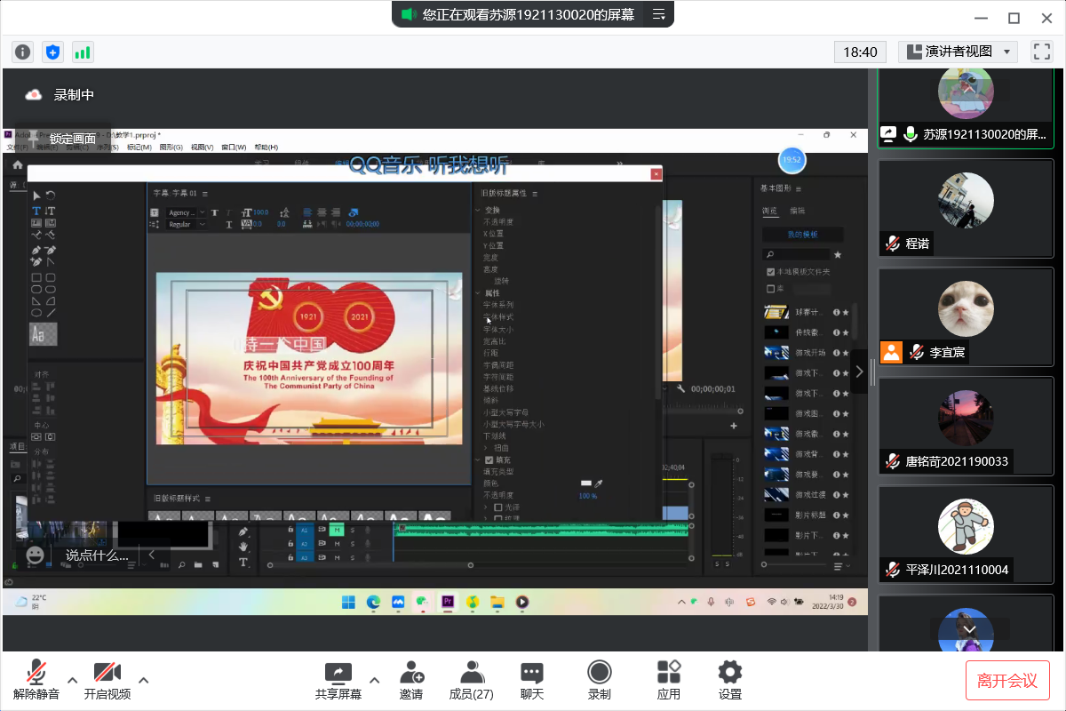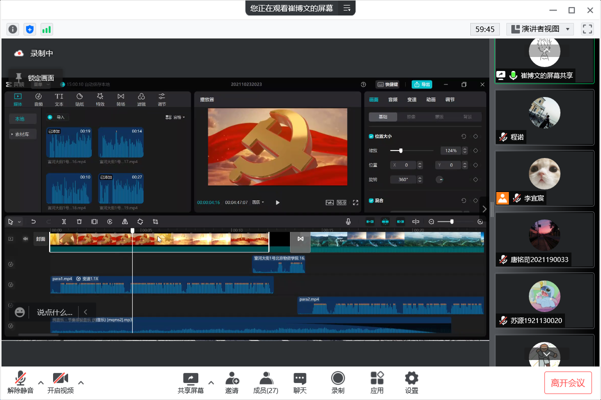 第二部分崔博文同学分享剪辑工具剪映的运用,这款软件紧贴当今短视频制作,有较完整的视频制作模板体系。崔博文同学直入主题,通过视频举例进行一系列细节操作讲解,例如关键帧 、图片透明度、图片插入位置、片段转场、字幕照片声音导入转场配合方法等等,通过细节操作提高了视频整体效果,对视频剪辑进入了更深一层的讲解。通过崔博文同学的讲解,同学们对剪辑视频的了解提升了一个层次,不仅了解细节配合处理步骤以及难点,还可以更好地了解到视频效果更好体现的方法。