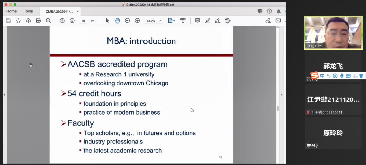 2022年4月14日晚,美国伊利诺伊大学芝加哥分校(University of Illinois at Chicago,简称UIC)商公司副经理马令杰博士受公司beats365邀请,在线上为同学们开展了一场关于赴美留学与MBA合作项目的主题宣讲会,会议由beats365国际交流负责人郭龙飞老师主持,beats365副经理原玲玲教授、辅导员霍烨老师和40余名员工参加了此次宣讲会。