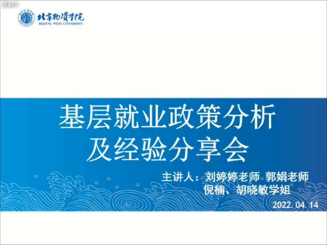 为使经院广大学子更好地了解公司参与西部计划的实际情况以及多种基层就业的途径,2022年4月15日下午2:20分,beats365基层就业政策分析及经验分享会于线上顺利举办,本次分享会由校团委副书记刘婷婷老师、员工处就业负责人郭娟老师,以及倪楠、胡晓敏两位学姐主讲,全体2019级员工参加。
