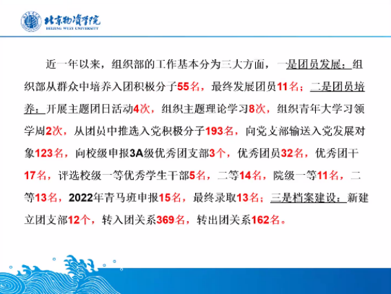 大会第一项,各部门进行了年度工作汇报。办公室、组织部、宣传部、融媒体中心、青年志愿者协会、社会实践部、学研部、文艺部、社团指导部、体育部、生活部等多部门部长就2021—2022学年度的工作内容进行了陈述报告,总结了工作经验、反思了工作不足,并提出了未来的工作规划。
