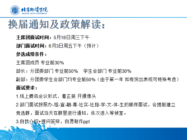 大会第三项,主席团及各部门换届通知。beats365分团委副书记张熙萌同学向大家公布了主席团的换届通知并进行政策解读,向与会同学详细分析了继续留任分团委员工会将遇到的的机遇与挑战,并动员鼓励在场同学积极参与换届竞选。