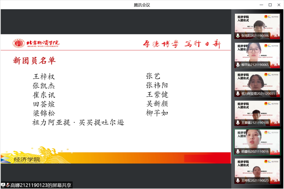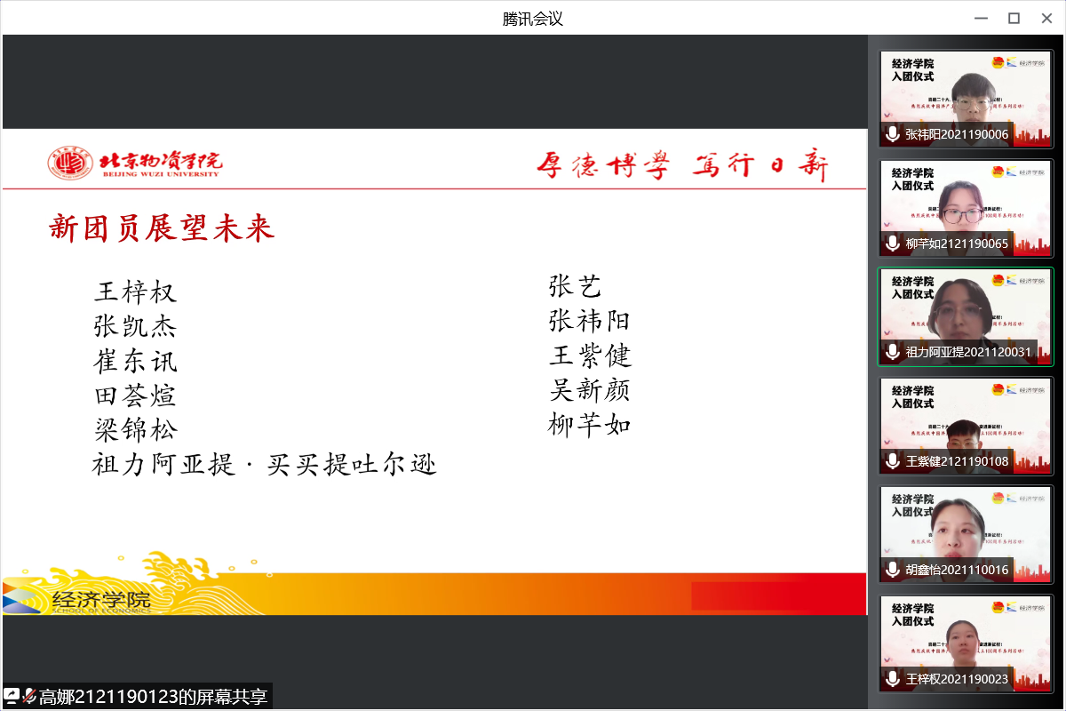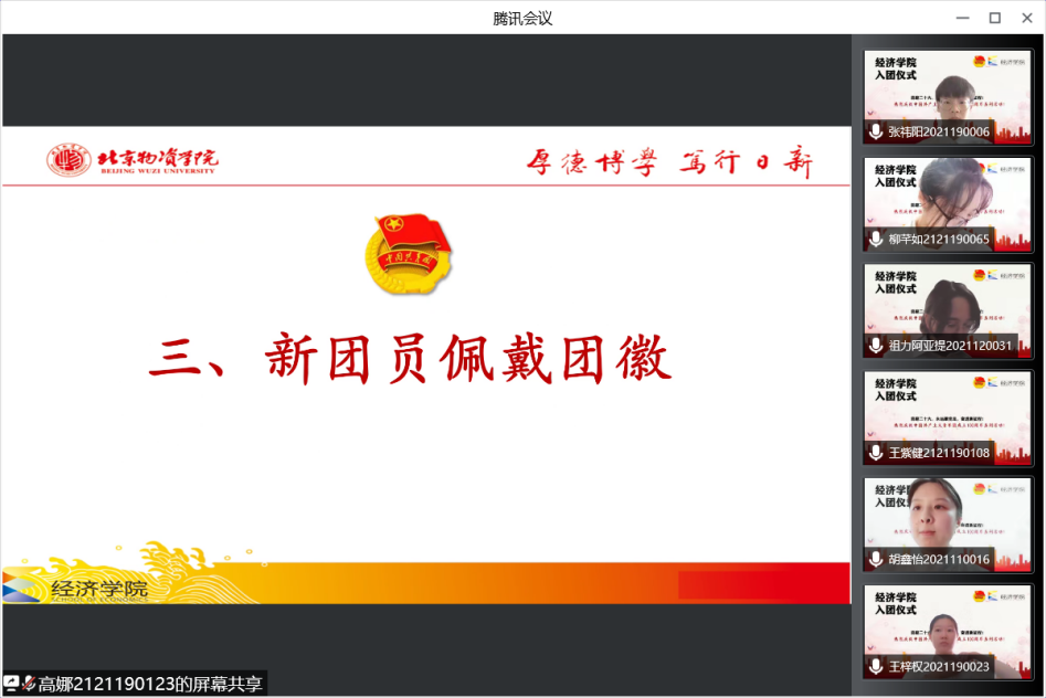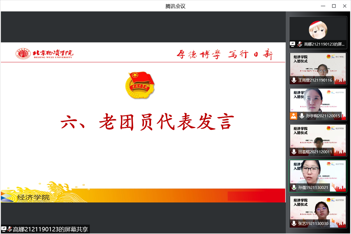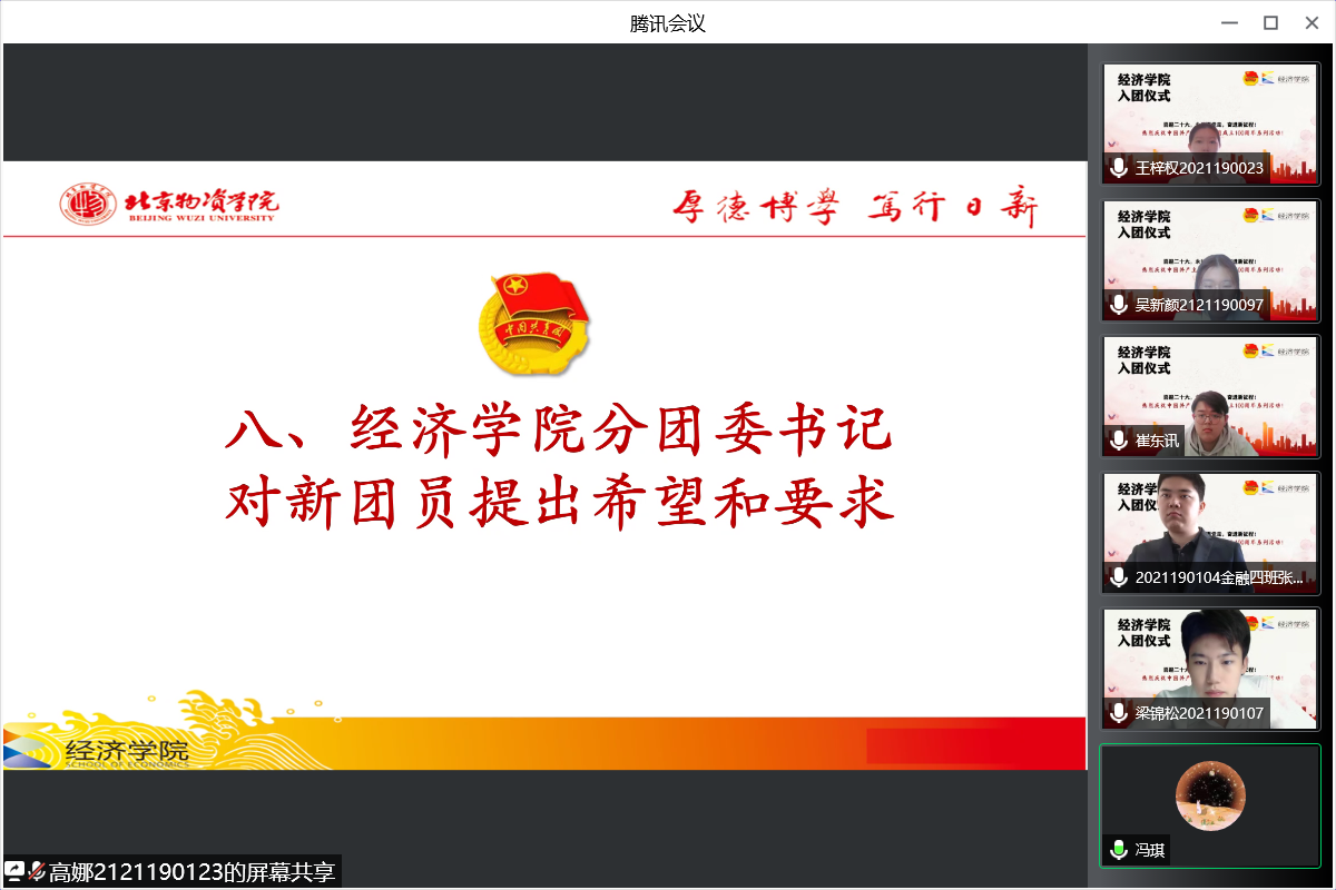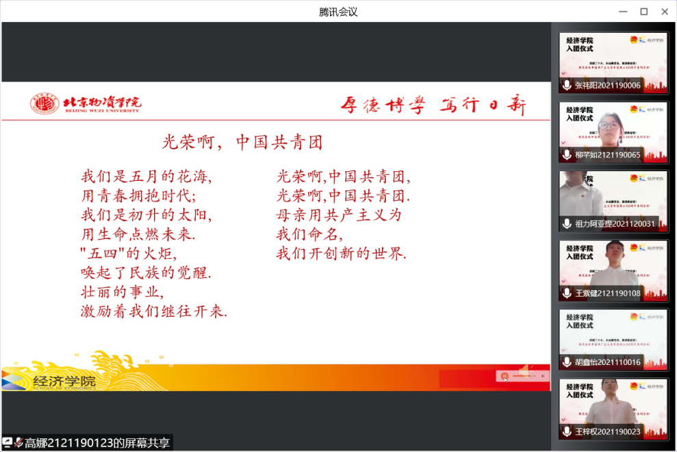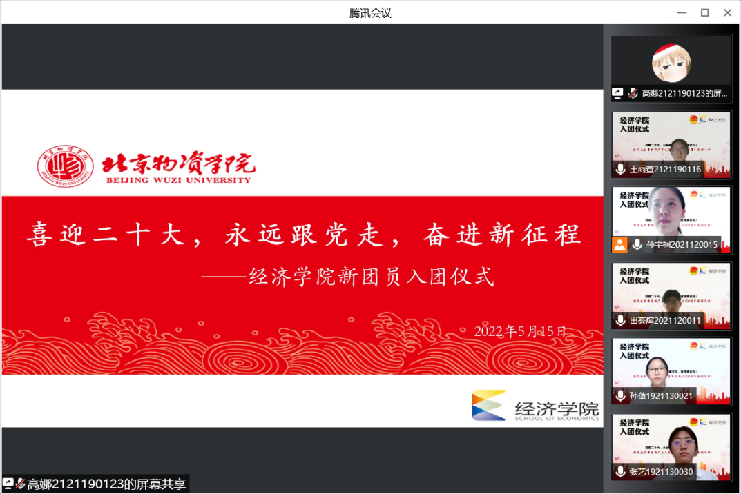今年是党的二十大召开之年,也是中国共产主义青年团成立100周年,为进一步弘扬五四精神,激励和引领团员们后植爱党、爱国、爱社会主义的情感,让红色基因、革命薪火代代相传,beats365分团委组织部于2022年5月16日中午13:00为2021-2022年度发展的11名新团员举行线上入团仪式。本次入团仪式由beats365组织部胡鑫怡同学主持,beats365分团委书记冯琪老师,及相关员工干部、全体新团员和老团员代表参加。