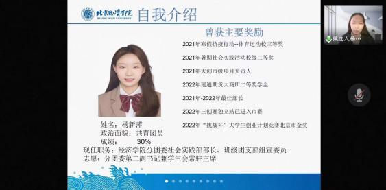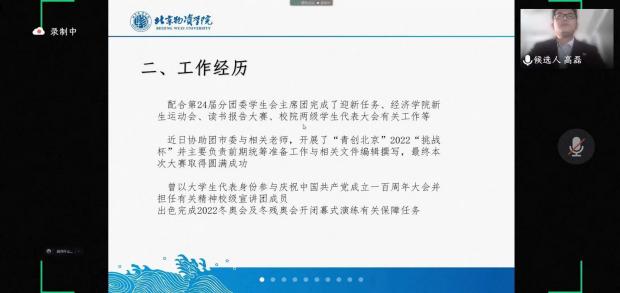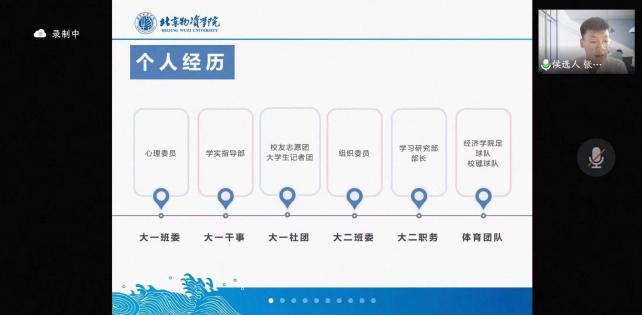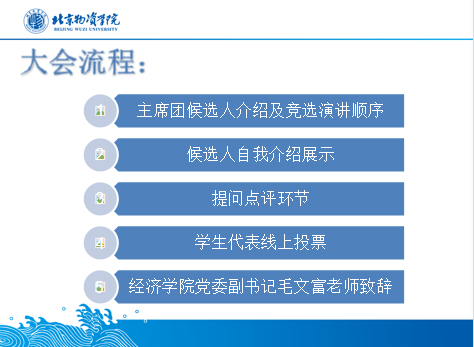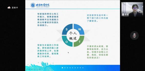 会议第二项,候选人进行自我介绍展示。在此环节中,竞选者们主要通过自我介绍、工作经历、曾获荣誉、自我分析和未来展望展示自己,他们通过良好的形象、流畅的语言及清晰的逻辑生动展现了他们兢兢业业的工作态度以及乐于为同学们奉献服务的热忱。