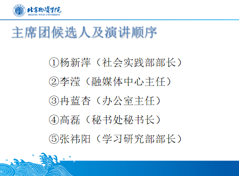 会议第一项,主席团候选人介绍。此次会议共5位候选人参与竞选,分别为:杨新萍、李滢、冉蓝杏、高磊、张祎阳同学。