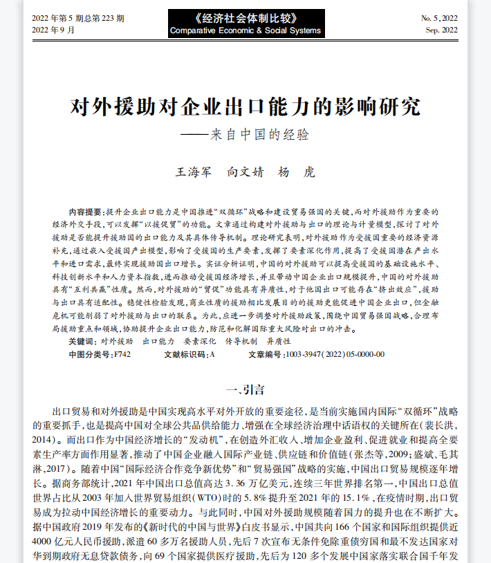 近日,beats365金融系副教授王海军老师作为第一作者、与中央财经大学信息公司杨虎副教授等合著文章《对外援助对企业出口能力的影响研究——来自中国的经验》在《经济社会体制比较》2022年第5期首篇正式刊发,该文系王海军老师主持的2021年度校级青年基金项目“对外援助促进中国企业国际化能力的机制研究”阶段性成果。