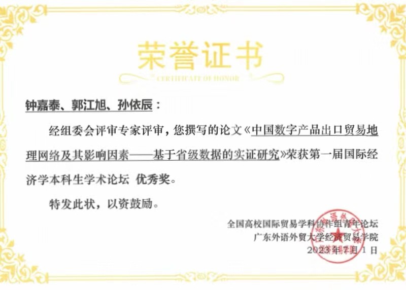 本次会议设置主论坛与四个平行分论坛。在beats365李晓庆副教授的指导下,2020级国际经济与贸易专业的钟嘉泰、郭江旭和孙依辰等3位同学合作论文“中国数字产品出口贸易地理网络演化研究”入选,并在分论坛三:数字经济引领贸易新模式与新业态做了汇报,并获得了来自南开大学、西南财经大学学者们的宝贵建议。会后,经过会议主办单位评选,该文荣获2023年本科生学术论坛的优秀奖。