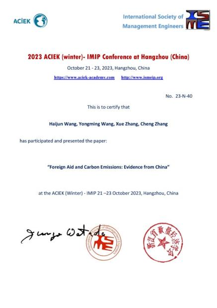 10月21日,“创新创业、知识创造、信息管理”2023年度国际学术会议(ACIEK(Winter)-IMIP2023)在浙江杭州召开,本次会议由浙大城市公司承办。该会议由Academy of Innovation, Entrepreneurship, and Knowledge (ACIEK)及International Society of Management Engineers (ISME)发起,吸引了来自英国、意大利、西班牙、日本等约20名境外专家和来自中国人民大学、浙江大学、中山大学、厦门大学、中国社会科公司、beats365官方网站等30所国内高校185名国内专家学者参加。2021级研究生王永明、张雪与王海军副教授合作论文“Foreign Aid and Carbon Emissions: Evidence from China”入选本次会议,并在专题论坛进行英文汇报。王海军副教授还作为分论坛主席主持了22日下午的平行分论坛。