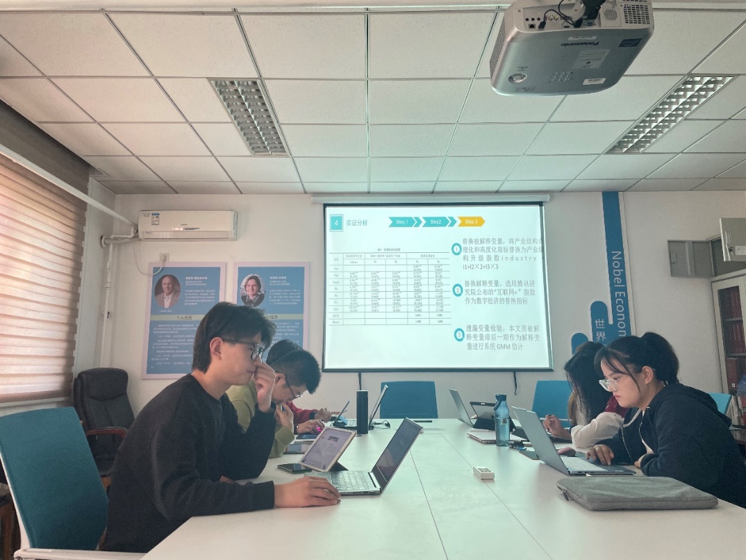 本次沙龙的主要发言人是李嘉傲同学和牟文倩同学。李嘉傲同学汇报的论文题目是《数字经济、流通效率和产业结构》,通过中介模型、双门槛效应模型检验数字经济、流通效率和产业结构升级之间的关系;从缩短供应链整体时间、提升供需匹配能力以及消除交换壁垒等方面阐述数字经济提高流通效率的途径。