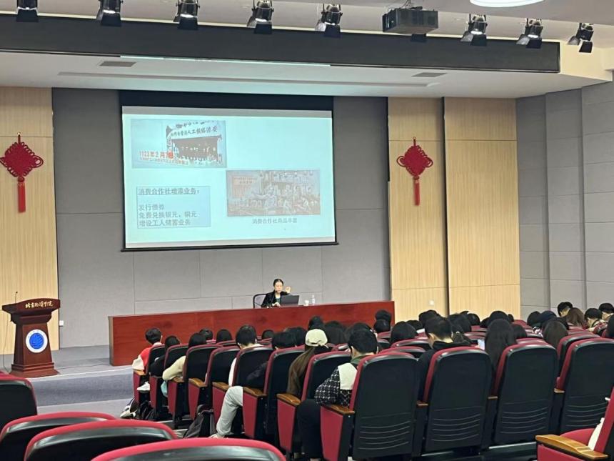 王老师首先从“工”“农”两个源头介绍了中国共产党红色金融筚路蓝缕的创始历程。为了使工农群众免受剥削之苦,党领导工人组织创建了消费合作社,领导农民组织建立了农民银行。既让农民的负担得以大大减轻,也让党组织获得壮大发展的物质基础。