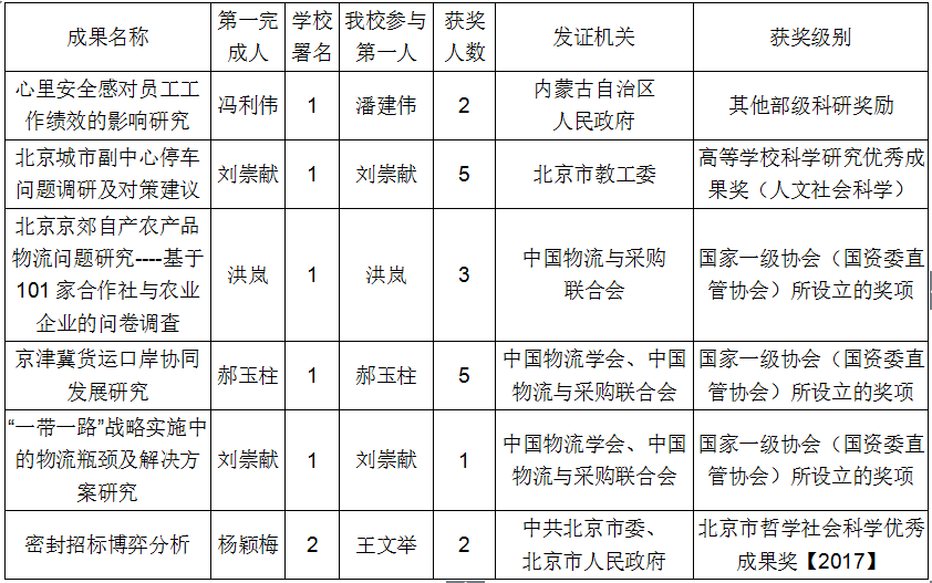 8.科研获奖有所增加。2017年,共有6人次获得各级科研成果奖励。包括北京市哲学社会科学优秀成果奖、高等公司科学研究优秀成果奖(人文社会科学)和内蒙古自治区人民政府奖励等省部级奖励。