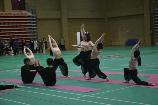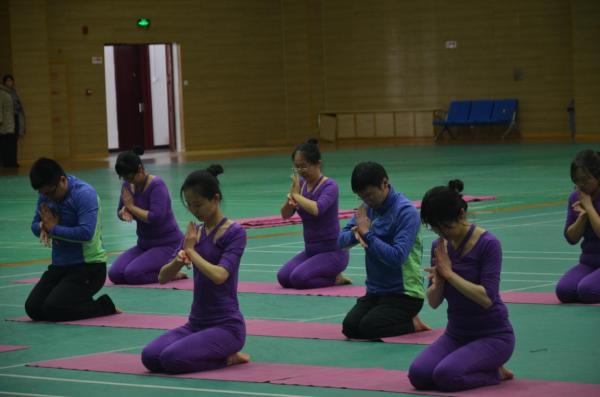 在团体瑜伽竞技中,伴随着淡雅悠扬的音乐,公司员工团体组时而酣畅淋漓,时而淡然优雅,心无旁骛的表演着瑜伽。看着选手们优雅的动作,空气中仿佛散发着淡淡的幽香。而公司教职工身穿统一的瑜伽服,在萦绕全场的袅袅音乐声中,整齐划一地做着一致的动作。他们双掌合拢盘腿而坐,随着悠扬的音乐声,大家双手叉腰,头部及腰部缓缓的左右转动,随着音乐节奏的变换,大家缓缓起立,高举双手,随后逐渐地向下弯腰,触碰脚尖。在这样的一动一静,一屏一息间享受着瑜伽带来的乐趣与魅力。在这次比赛中,我们的老师在赛场上的表现毫不亚于他们作为教师时在讲台上的精彩讲演。他们在包容中绽放,在力量中回归。方寸大的垫子上,演绎出不一样的精彩。