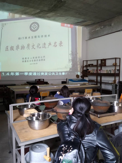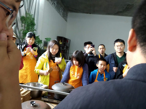 大家按照杨掌门的讲解,每人把分得的浸泡了的黄豆进行磨浆、烧水、搅拌、过滤、点浆、压制等步骤一步一步制作出了热气腾腾的豆腐。在中午简单的餐宴上,大家都吃到了自己亲手制作的豆腐,大人和小孩都很兴奋。