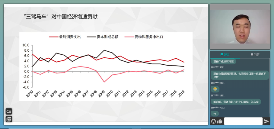 讲座上,黄耀老师结合自身的实践经验,理论联系实际,首先以此次疫情为大背景分析了疫情对国贸板块的影响,同时介绍并分析了“三驾马车”即最终消费支出、资本形成总额及货物和服务净出口对中国经济增速的贡献。
