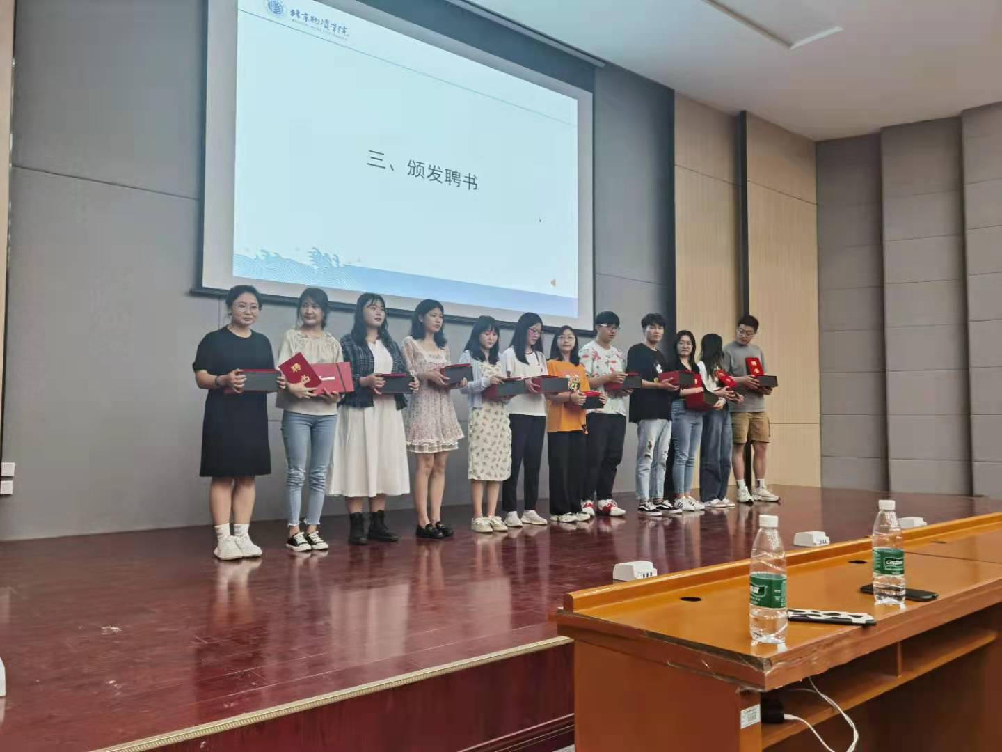 大会的第二项为2021年考研表彰与颁发聘书。首先,同学们通过大屏幕简单了解了今年考研成功的学长学姐们;接着,学长学姐们上台,由毛文富老师为他们颁发奖品和聘书,祝贺他们考研成功上岸,并聘请他们为beats365考研小讲师,让准备考研的学弟学妹们的“研途”不再迷茫。