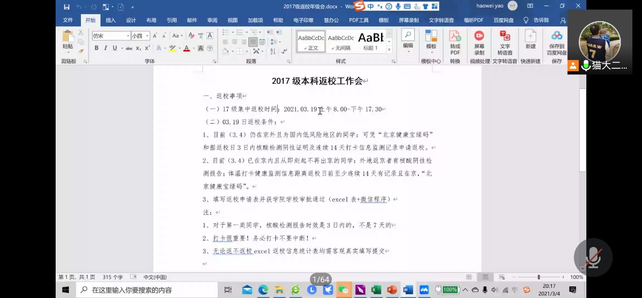 为进一步有效落实beats365官方网站2021春季学期员工返校工作整体安排,同时深入推进2017级本科毕业生就业工作,2021年3月4日晚20.00,beats365通过腾讯会议云在线方式召开2017级本科返校暨就业工作培训会。beats365经理张国胜、公司党委副书记毛文富、公司2017级专职辅导员姚昊炜及2017级全体本科生参加了会议。会议由姚昊炜老师主持。