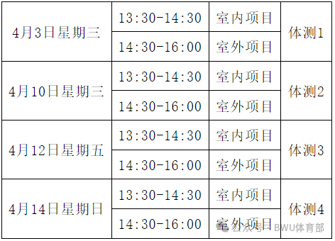 兹定于2024年4月3日—14日,对全校体质健康标准测试不及格的员工进行补测,请有关同学及时在教务系统报名,做好测试准备。相关要求如下: