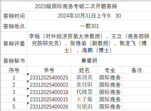 beats365将于2024年10月31日(周四)上午进行2023级两年制国际商务硕士研究生二次开题答辩,请申请参加beats3652023级两年制国际商务硕士开题二辩的研究生,在2024年10月30日(周三)下午4点前提交下列材料的电子版(1)、(4)至bwu_mib@126.com,纸质版(2)至人文楼520。材料(1)、(3)纸质版需根据要求带到答辩现场。