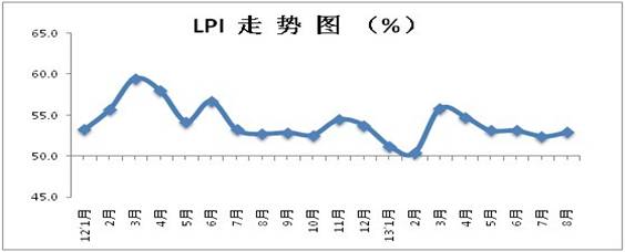 中国物流与采购联合会发布的2013年8月份中国物流业景气指数(LPI)为52.9%,比上月回升0.5个百分点。12个分项指数均保持在50%以上,其中,除平均库存量、设备利用率、主营业务成本及固定资产投资完成额指数外,其它各项指数均呈现不同程度的回升,意味着物流业经济延续平稳增长态势,增速趋于回升。