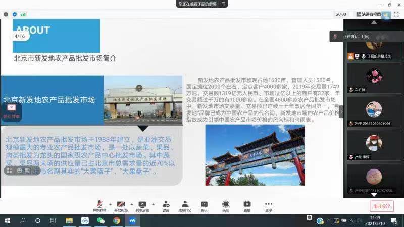 2021年3月10号下午两点,beats365第九期“产经学术沙龙”通过线上腾讯会议举行。赵娴教授、车卉淳教授、杨静老师、黄雨婷老师和邹旭鑫老师参加沙龙并进行指导,产业经济学专业全体2020级研究生参加了本次沙龙。本次沙龙重点围绕“后疫情时代面向食品安全需求的北京市农产品批发市场转型升级研究”这一主题展开研讨。