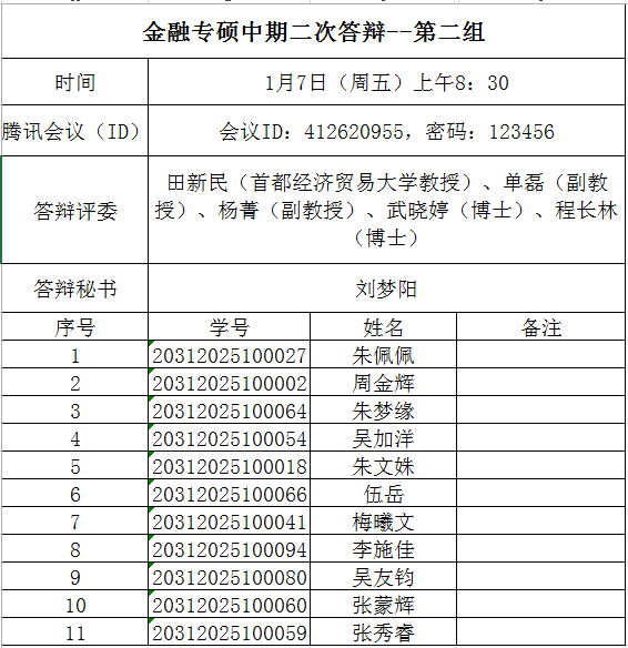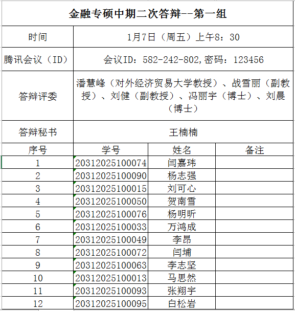 根据公司硕士学位论文管理文件和培养方案的相关要求,现采取线上视频会议的方式开展2020级金融专业硕士研究生学位论文中期检查(二次答辩)工作,具体安排如下: