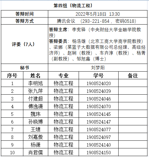 以上材料(第5项为有题目变动的同学提交)需于5月17日中午12点前提交,下午需要发送给专家。物流工程专硕以导师组为单位提交,学硕以班级为单位由班委统一发至jjxykm@126.com。