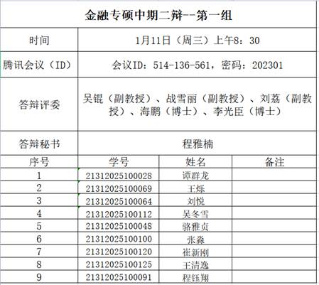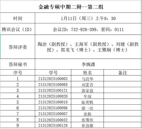 根据公司硕士学位论文管理文件和培养方案的相关要求,现采取线上视频会议的方式开展2021级金融专业硕士研究生学位论文中期检查(二次答辩)工作,具体安排如下: