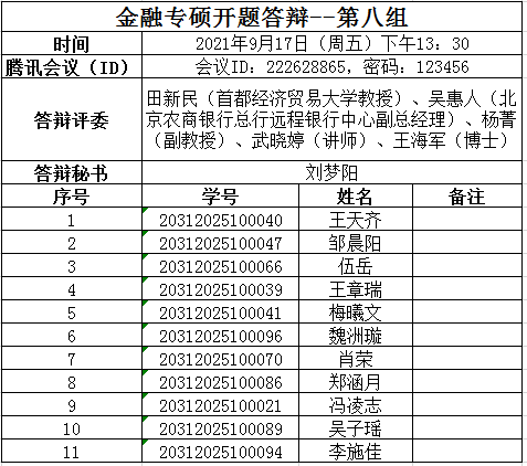 2020级两年制金融硕士研究生开题答辩,需每人提交下列材料到各班级负责人,由负责人汇总后于9月16日(周四)上午9:00前提交至人文楼310郭老师处,提交材料包括:
