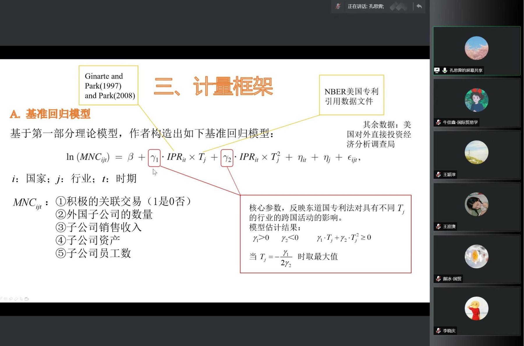 接着,孔思霁分享了L. Kamran Bilir发表在American Economic Review上的“Patent Laws, Product Life-Cycle Lengths, and Multinational Activity”本文研究的问题是南方知识产权保护对北方不同产品生命周期行业的跨国公司选址活动(外国直接投资和技术转让)的影响。文章采用了美国跨国公司数据,研究发现:对东道国专利制度敏感的主要集中于产品生命周期相对较长的行业,其中,产品生命周期中等行业的敏感性最为显著。在知识产权敏感行业中,强有力的东道国专利法吸引了相对较多的美国子公司,并带来现有美国子公司规模的扩张。本文值得学习借鉴的地方很多:(1)构建了含有知识产权保护的南北贸易模型;(2)提出了产品生命周期的测度方法:产品的专利技术市场寿命(一项专利持续被后续专利引用的时间长度)。期间,孔思霁详细地讲解了理论模型部分的数理推导,将高深的数理公式讲的很明白,展示了经济理论的数理魅力。同学们认识到理论模型的精读能够深化对话题理解,并能提升自己的研究。